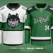 The away jersey has a clean white look with black accents and a bold green chest stripe featuring a standalone wolf. Both jerseys proudly display player names and numbers.
