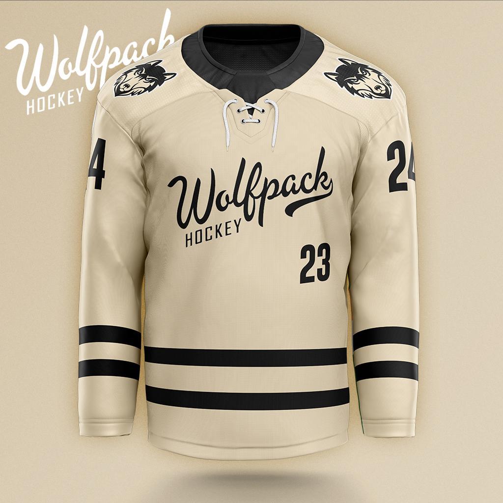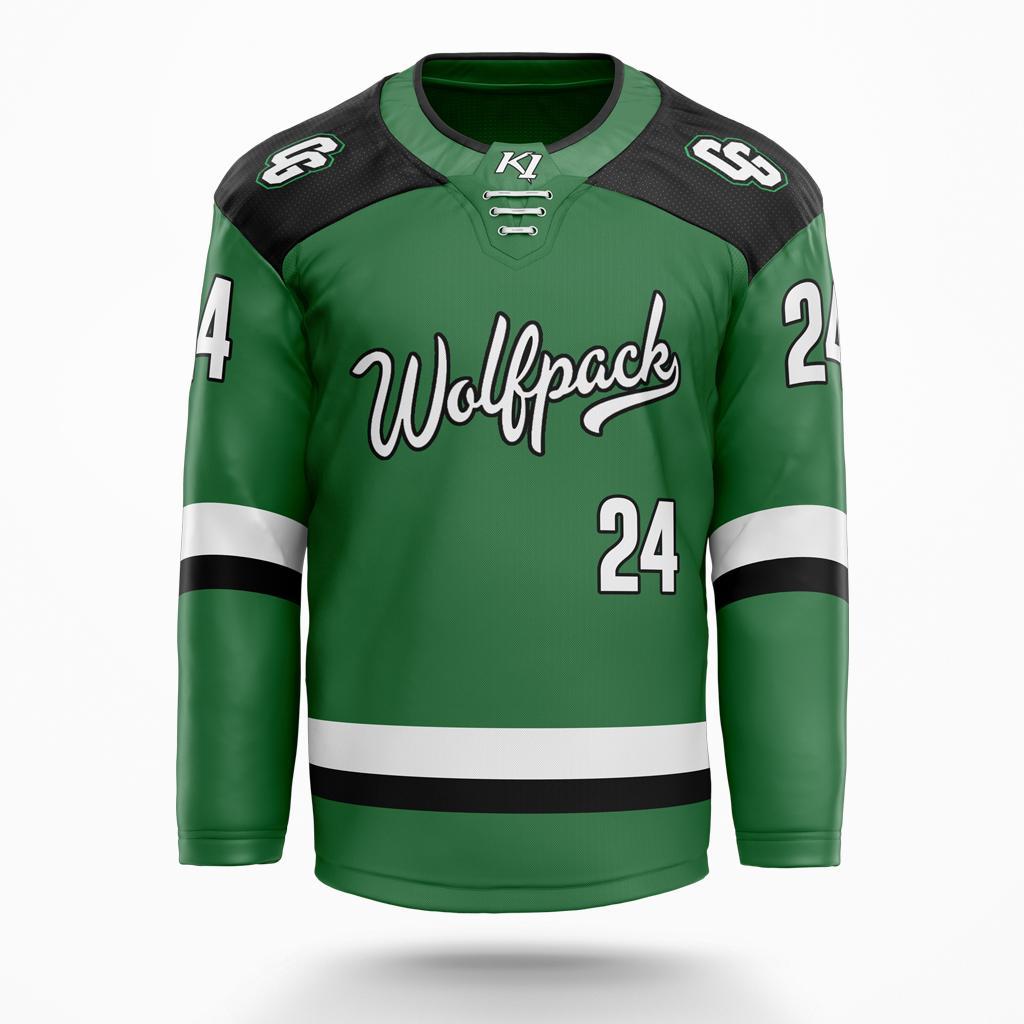 Our updated jerseys honor Wolfpack tradition with fresh designs. The home jersey features Wolfpack Forest Green with black shoulders, a new CG crest, and script "WOLFPACK." Added details include K1 neck laces, last names, and numbers on the back, chest, and arms.