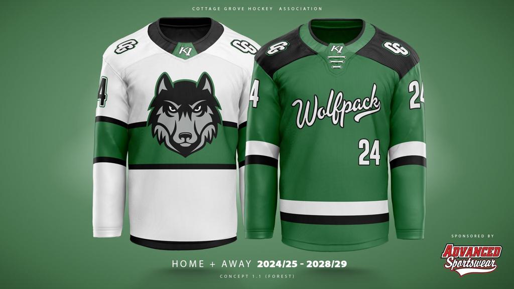 Since the Cottage Grove Hockey Association adopted the player-owned traveling jersey program, the jerseys have been updated every four years. The new jersey design will be in place for the next four seasons, concluding after the 2028/2029 hockey season. The imagery below highlights our journey from the past to the future, showing the transition from the classic heavy black jersey to the fresh Wolfpack Forest Green design.